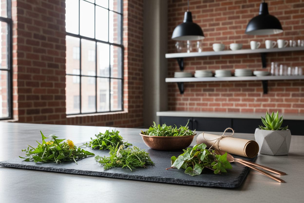 Wildkräuter-Frühlingssalat: Junge Löwenzahn- und Schafgarbenblätter mit Feldsalat, getrockneten Tomaten und einem Senf-Ahornsirup-Dressing mischen. Schlichter Ansatz, viel Aroma.