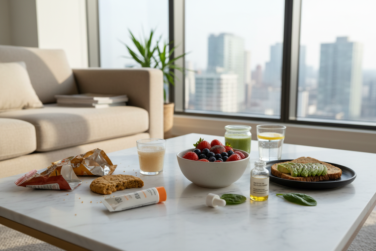 Eine randomisierte Studie (PMC, 2023) belegt: Gute Hauthydrierung reduziert Faltenintensität messbar. 1,5 bis 2 Liter Wasser täglich - ergänzt durch wasserreiche Lebensmittel wie Gurken, Wassermelone und Blattgemüse - hält die Haut prall und geschmeidig.