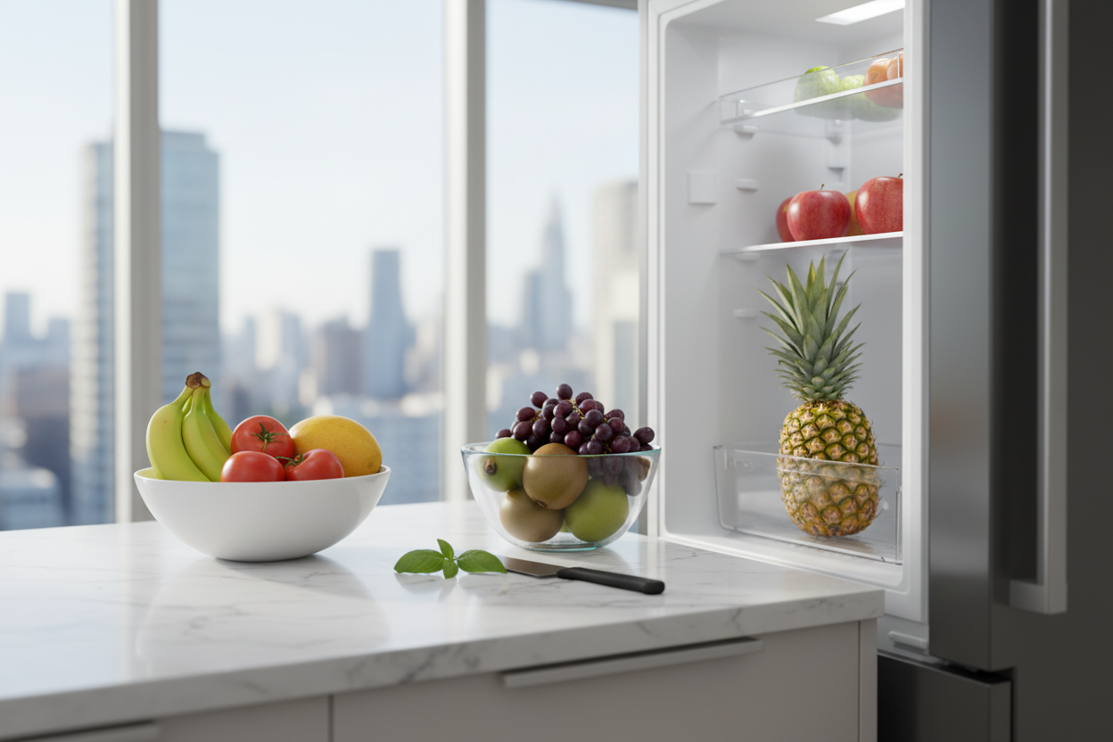 - Ethylen-Produzenten wie Äpfel, Tomaten, Gurken und Paprika separat lagern, da sie andere Früchte schneller reifen lassen