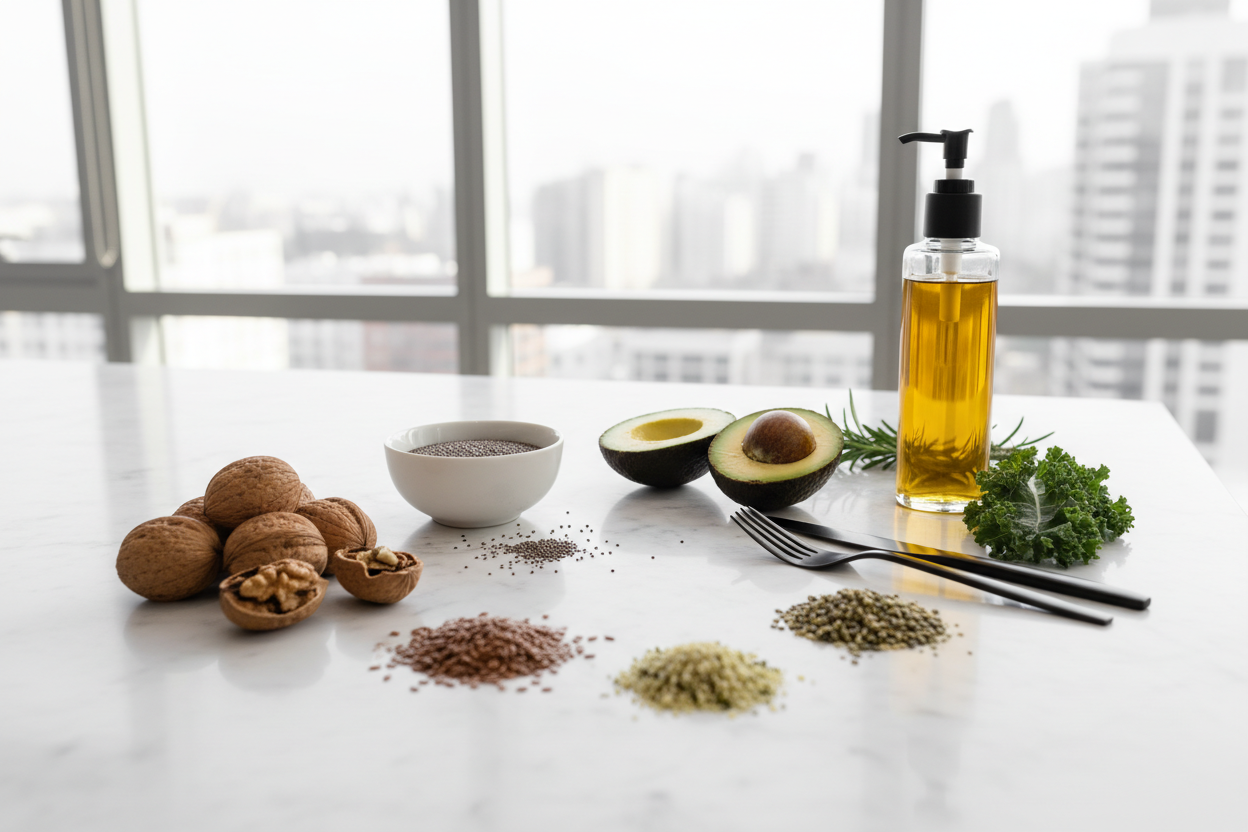 Omega-3-Ratio optimieren: Reduziere verarbeitete Lebensmittel mit Omega-6-Ölen (Sonnenblumenöl, Maisöl) und erhöhe Omega-3-reiche Quellen.