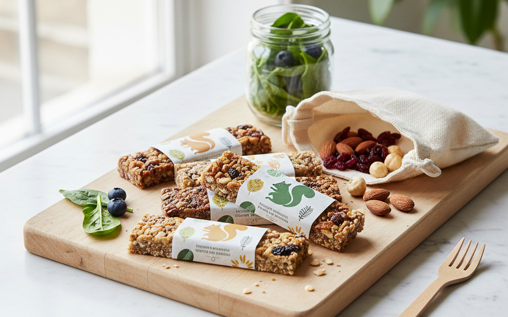 Datteln, Dinkelflocken, Rosinen, Mandeln, Sonnenblumenöl (<1%) und variierend nach Geschmack weitere natürliche Zutaten. Folgende Geschmacksrichtungen gibt es: