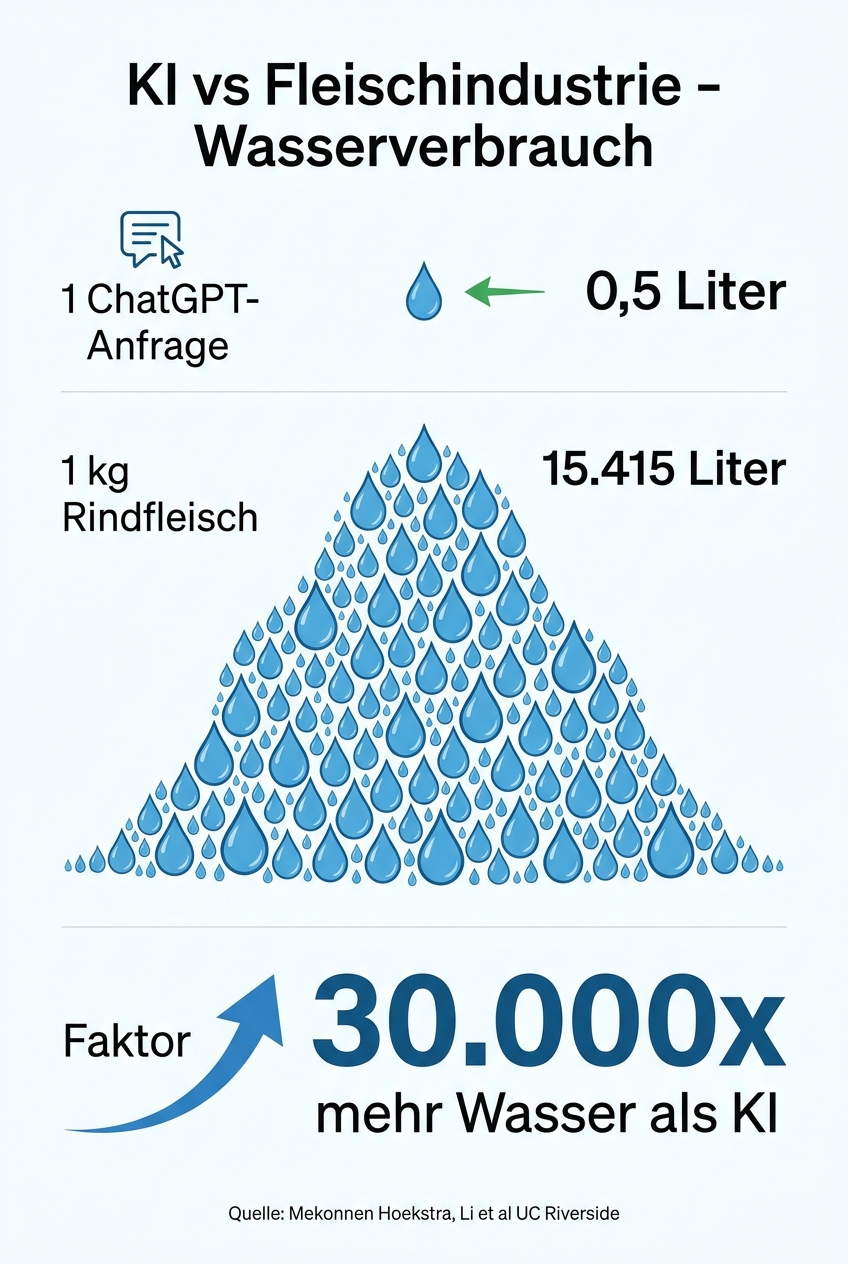 - Wer KI-Wasserverbrauch kritisiert und gleichzeitig Fleisch isst, hat ein Verhältnisproblem. Das ist keine moralische Wertung, das ist Mathematik.