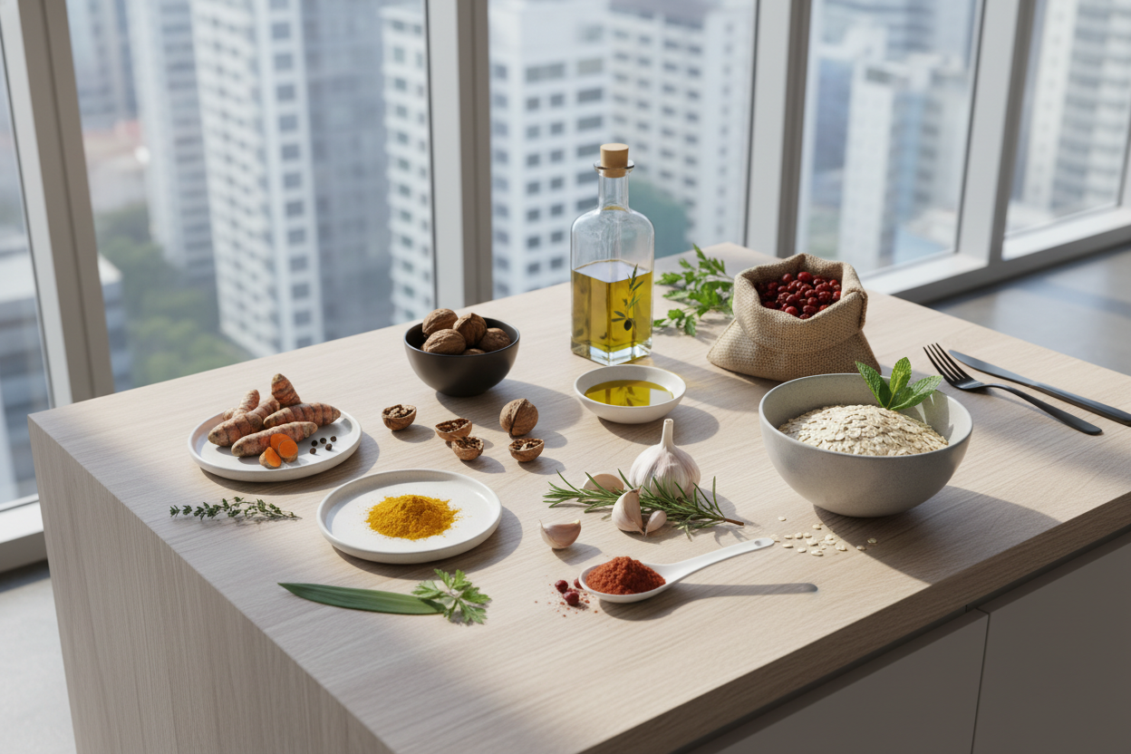 - Besonders gut belegt sind Kurkuma (Curcumin), Omega-3-reiche Lebensmittel wie Leinsamen und Walnüsse, Hagebutte (Vitamin C + Galactolipide), hochwertiges Olivenöl (Vitamin E + Oleocanthal), Knoblauch (Schwefelverbindungen) und Haferflocken (Silizium, Ballaststoffe). All diese Lebensmittel wirken laut Studien entzündungshemmend.