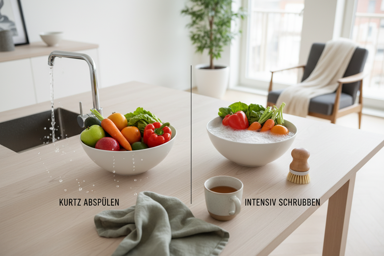 30 Sekunden unter fließendem Wasser sind das Minimum. Für maximale Sauberkeit: 15 Minuten Natron-Bad. Deine Gesundheit wird es dir danken.