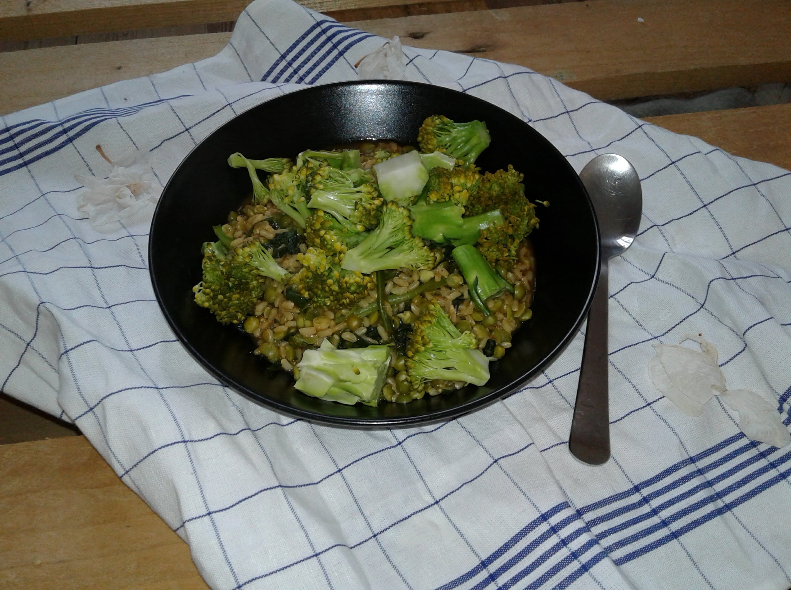- Nun wird der Reis, Wasser, grüne Erbsen, Spinat und Brokkoli mit dem Tomatenmark und den gewünschten Gewürzen in den Topf gegeben und im "Manual-Programm" für ca. 20 Minuten gekocht.