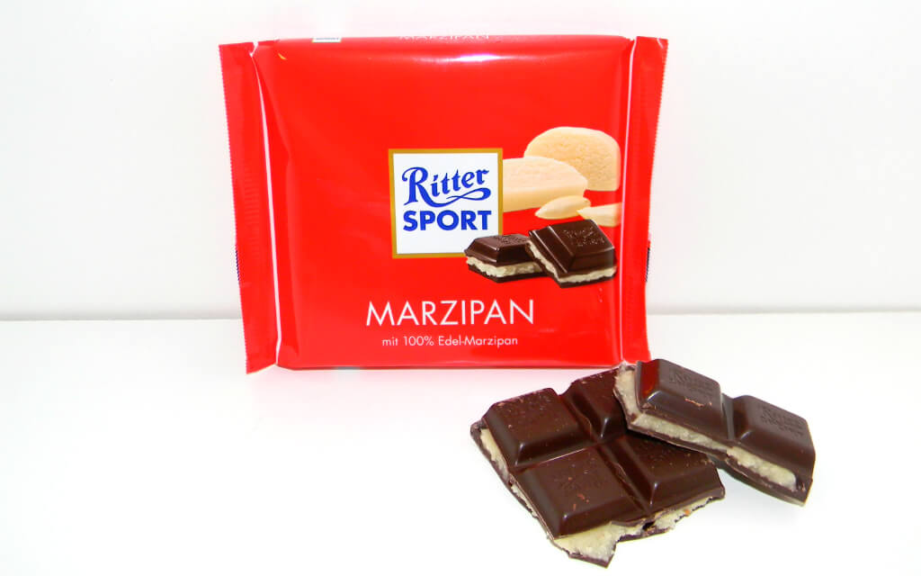 Mittlerweile gibt es eine Vielzahl von veganen Schokoladenvariationen. Wer jedoch nach Geschäftsschluss oder sonntags mal Lust auf Schokolade hat, wird vielleicht mit einer Ritter Sport Marzipan glücklich, die es in vielen Kiosken und Tankstellen gibt. \Als einzige Schokolade von Ritter Sport enthält bisher die Sorte Marzipan keine Milchbestandteile als Zutaten. Ab Ende August 2016 kommen jedoch zwei weitere vegane Sorten hinzu. Da dürfen wir uns freuen auf:
