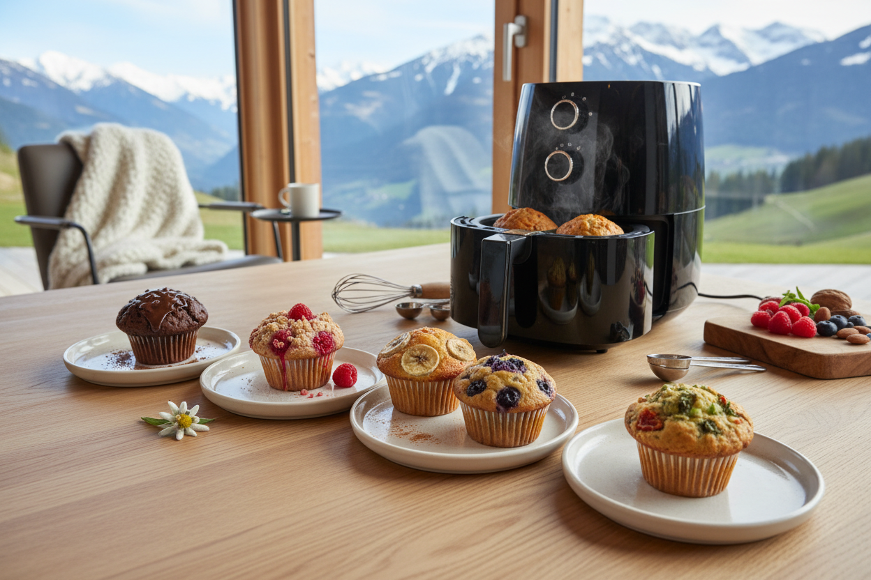 Ein Airfryer ist ein Kompakt-Heißluftgerät mit starkem Gebläse: Heiße Luft wird in hoher Geschwindigkeit ums Gargut zirkuliert. Laut EvvyTools (2025) penetriert Hitze im Airfryer dadurch bis zu 50% schneller als im konventionellen Backofen. Das Ergebnis beim Muffin-Backen: gleichmäßige Bräunung außen, saftiger Kern innen - und fertig in 30% weniger Zeit.