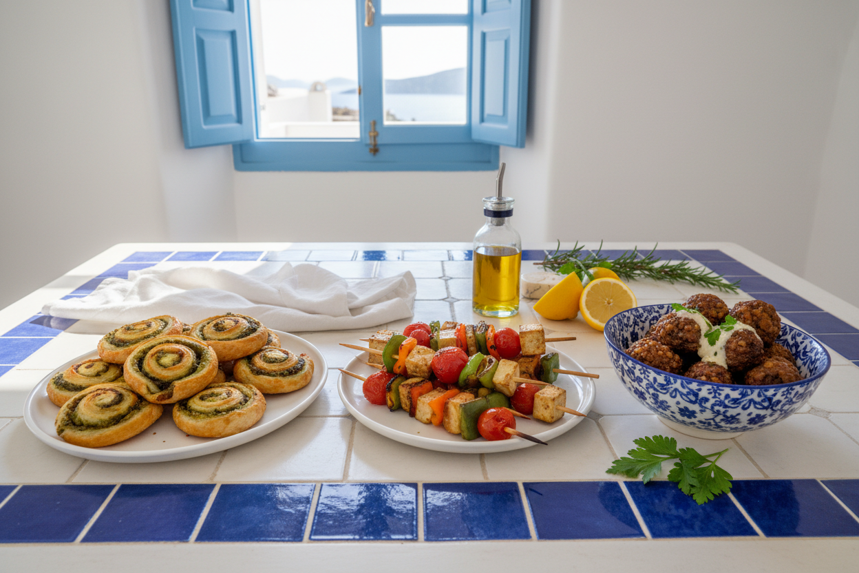 - Textur-Mix: etwas Knuspriges (Blätterteig, Falafel), etwas Frisches (Spieße, Rohkost), etwas Cremiges (Dips, gefüllte Cups)