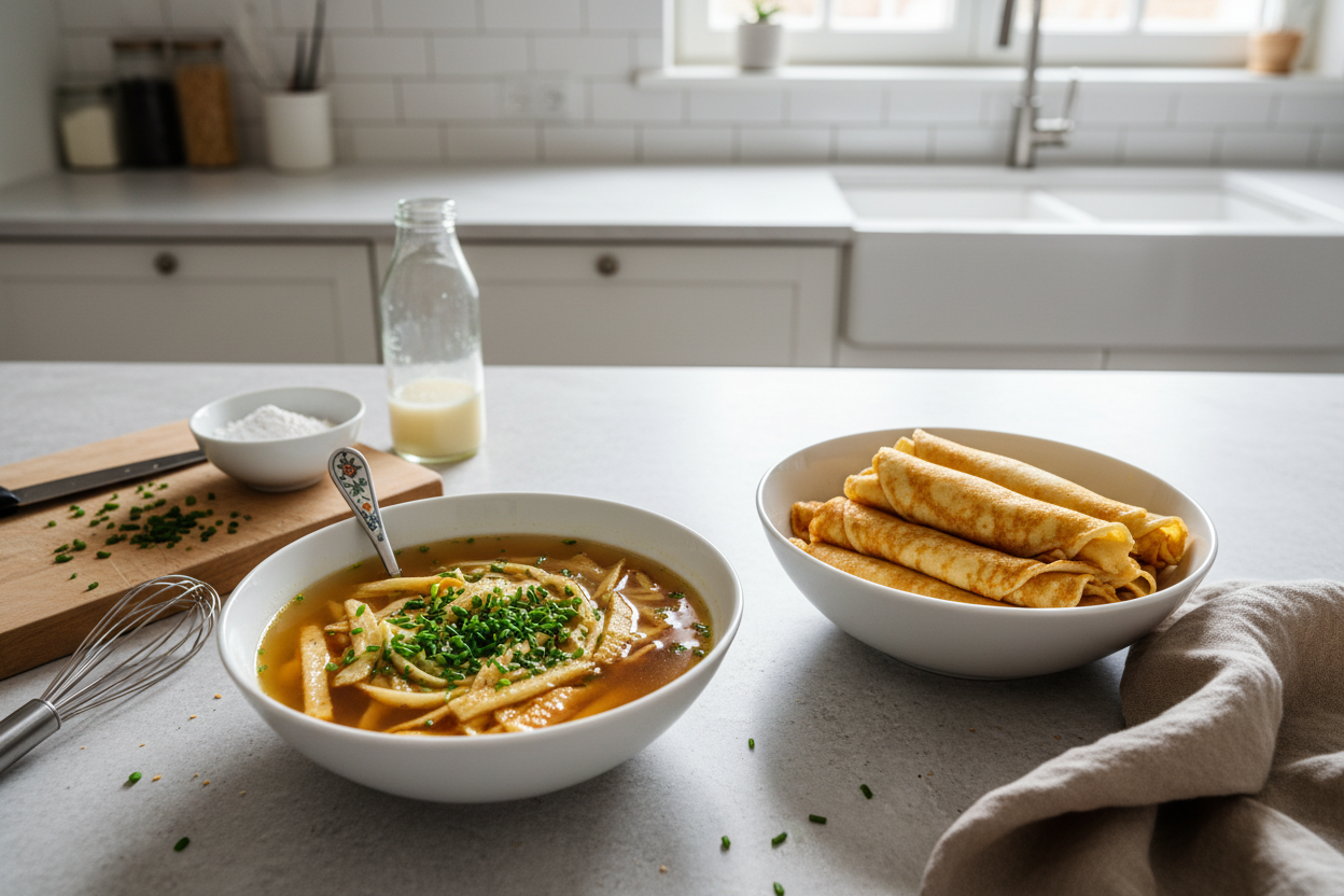 Frittatensuppe ist eine der bekanntesten Suppeneinlagen der österreichischen Küche. Wien.info listet sie als Klassiker der Wiener Mehlspeisenküche - ein Rezept, das seit Generationen bei Familienfeiern, in Gasthäusern und als Vorstleibes Sonntagsgericht serviert wird.