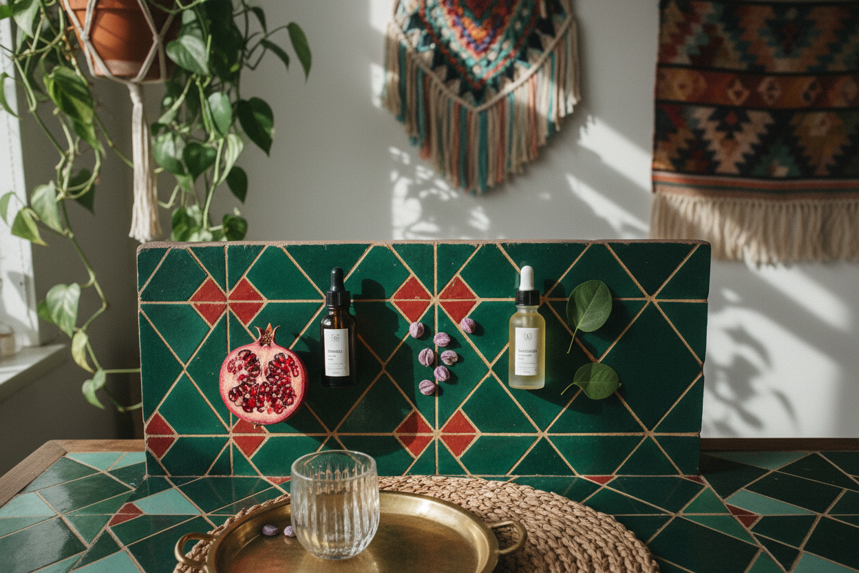 - Bakuchiol-Serum: Trage 2-3 Tropfen eines Serums mit 0,5-1% Bakuchiol auf