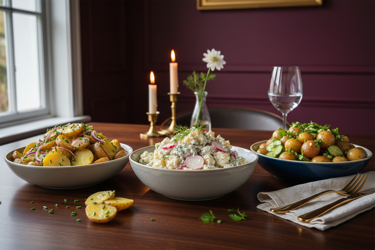 - Die beliebtesten veganen Variationen sind der klassische Wiener Erdäpfelsalat mit Brühendressing, die cremige Mayo-Version, der Frühlings-Kartoffelsalat mit Radieschen und Kräutern, die süß-saure Apfel-Version aus Norddeutschland sowie eine proteinreiche Variante mit Räuchertofu oder Kichererbsen.