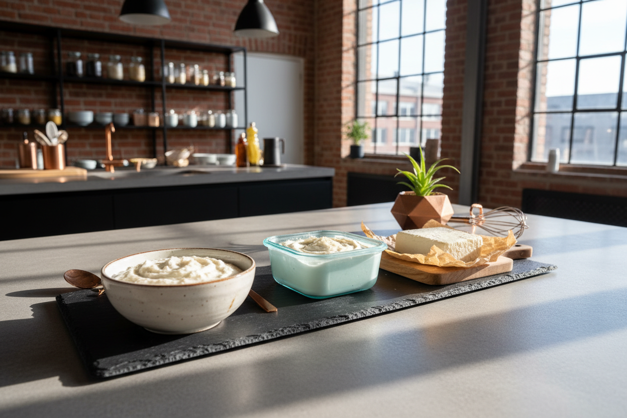Schnellere Variante ohne Fermentation: Seidentofu im Hochleistungsmixer glatt püriert, mit Zitronensaft, einer Prise Salz und etwas Kokosöl abgeschmeckt, ergibt eine cremige Masse, die sich für viele Rezepte eignet. Diese Methode dauert nur wenige Minuten und liefert ein vielseitig einsetzbares Ergebnis.