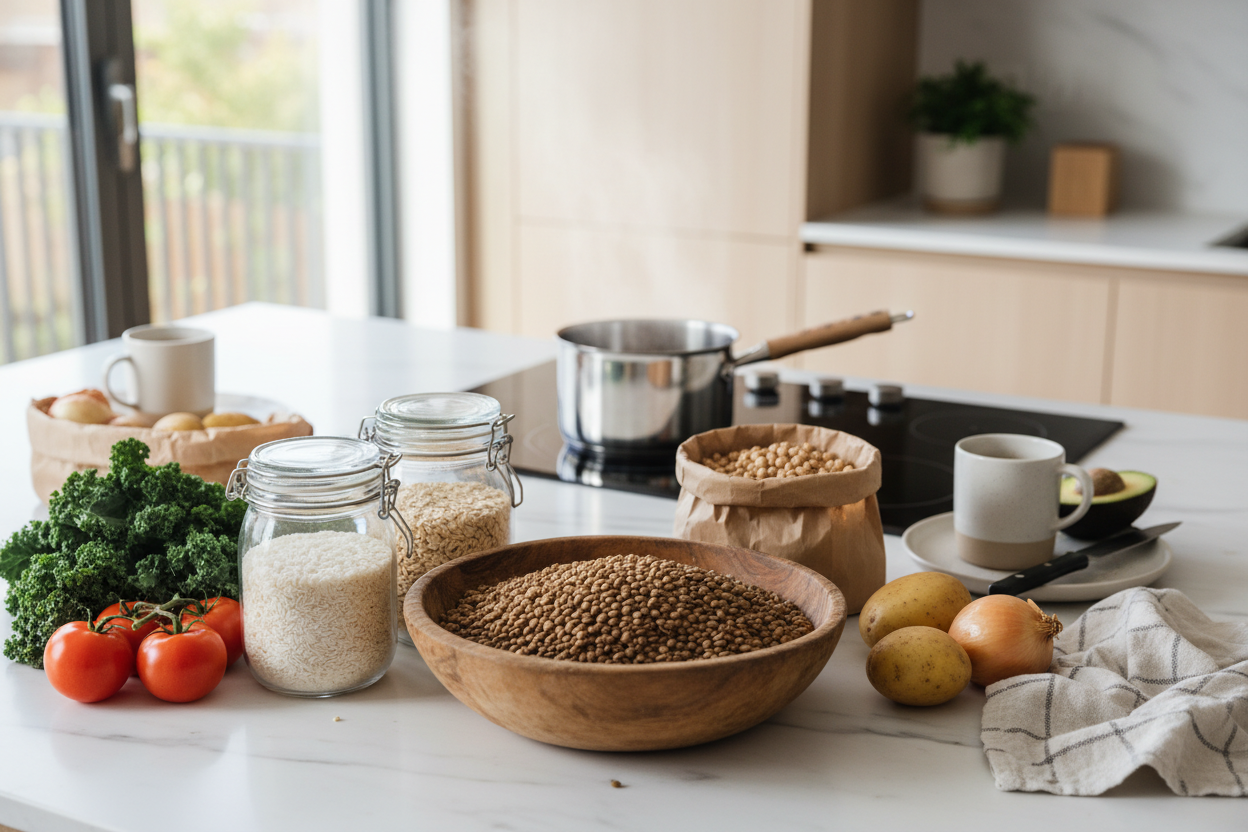 Die günstigsten Lebensmittel sind von Natur aus pflanzlich: Kartoffeln, Reis, Haferflocken, Linsen, Kichererbsen, Bohnen, saisonales Gemüse. Laut der Veganen Gesellschaft Österreich gehören Hülsenfrüchte und Getreide zu den günstigsten Proteinquellen überhaupt – und haben gleichzeitig eine jahrelange Haltbarkeit.