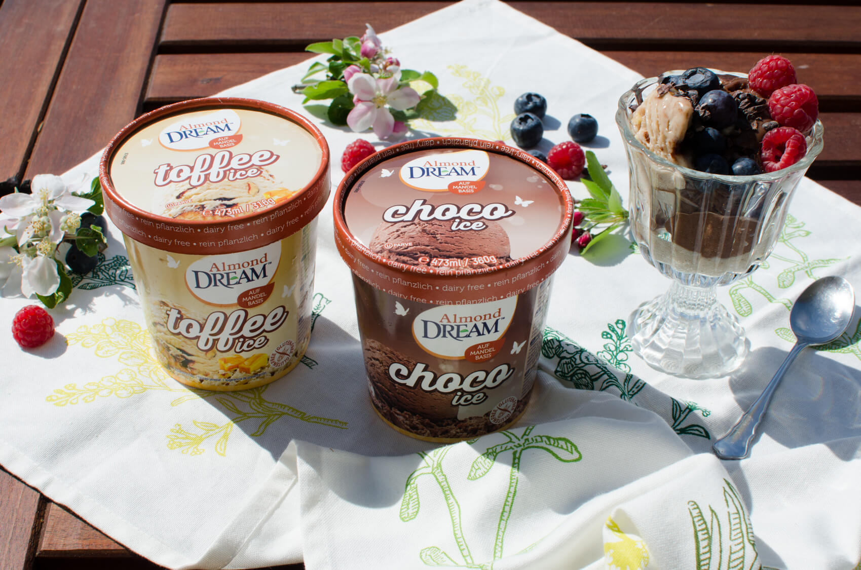 Bisher war der Sommer für VeganerInnen noch eine Durststrecke. Während alle Eis schlecken, mussten wir VeganerInnen noch gezielt auf die Suche gehen, um auch auf unsere Eis-Kosten zu kommen oder uns mit wässrigen Fruchteissorten zufrieden geben. Das Eis-Vergnügen war einfach noch nicht ganz so großartig. Aber das hat jetzt ein Ende, denn das vegane Eis von Dream auf Basis von Mandeln ist jetzt auch hierzulande pünktlich zum Sommer erhältlich. Falls Ihr es noch nicht kennt, probiert es unbedingt aus, denn es schmeckt viel cremiger und samtiger als die anderen veganen Brands, die bei uns bisher im Supermarkt vertreten waren. Die Textur ist wirklich etwas ganz besonderes.