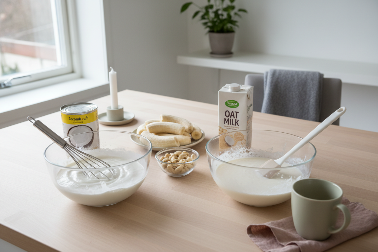 - Kokosmilch (Vollfett, mind. 17% Fett) liefert das cremigste Ergebnis, da der hohe Saettigungsfettgehalt die Kristallbildung verlangsamt. Cashews ergeben ein neutrales, seidiges Eis ideal fuer Vanille- und Fruchtaromen. Hafermilch mit etwas Xanthan Gum funktioniert ebenfalls gut. Gefrorene Bananen (Nicecream) brauchen gar keine weiteren Zutaten.