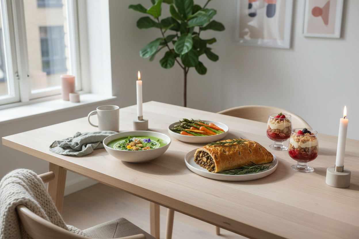 Für große Runden und beeindruckende Momente am Tisch sind Mushroom Wellington oder Nussbraten die richtige Wahl. Forks Over Knives empfiehlt Wellington-Füllungen bereits am Vortag vorzubereiten – so bleibt am Festtag nur noch das Einwickeln und Backen.