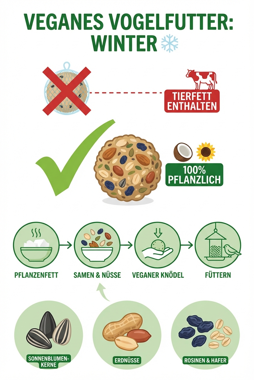 Wichtig zu wissen: Die Wildvogelhilfe betont, dass das Fett bei 10°C komplett aushärten muss. Zu weiches Fett kann ins Gefieder gelangen und die Vögel beim Fliegen behindern. Kokosfett mit seinem Schmelzpunkt von 27°C ist daher nur für den Winter geeignet.