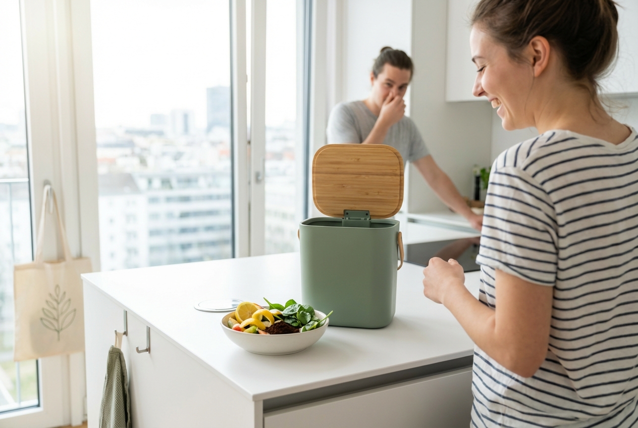 Ein Biomüll-Eimer mit Deckel und Aktivkohlefilter. Kostet zwischen 20 und 40 Euro und hält Gerüche deutlich besser zurück als offene Behälter.