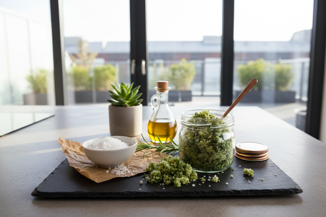 Der Frühling ist die perfekte Zeit, um der Haut einen frischen Start zu schenken. Dieses vegane Rosmarin-Peeling entfernt sanft abgestorbene Hautzellen und regt die Durchblutung an - Rosmarin wirkt dabei wie ein natürlicher Aktivator für die Haut. Das Olivenöl macht die Haut geschmeidig, ohne sie zu beschweren.