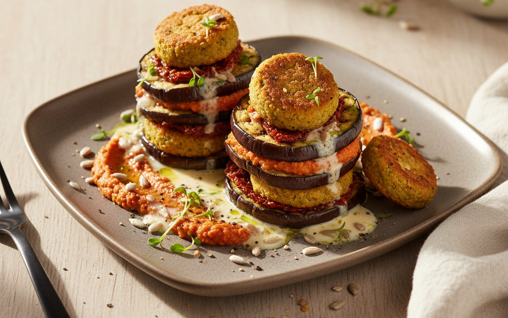 - Eine Melanzani Scheibe nach der anderen mit Bio-Hummus bestreichen und auf 2 Tellern auftürmen. Dazu die Falafel mit der Sonnenblumenkern-Sauce reichen und mit Kresse garnieren.