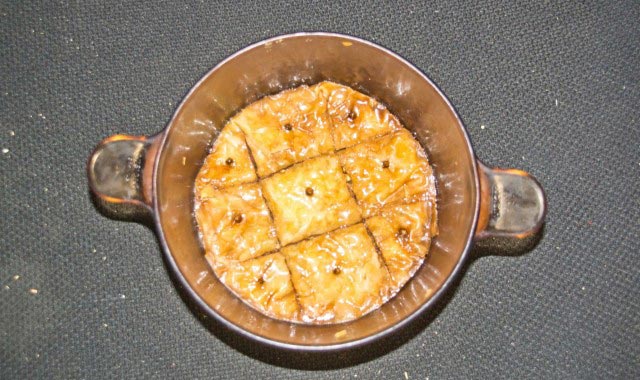 - Das heiße Baklava aus dem Ofen nehmen und sofort den heißen Sirup gleichmäßig darüber gießen. Mindestens 4 Stunden, besser über Nacht, durchziehen lassen.