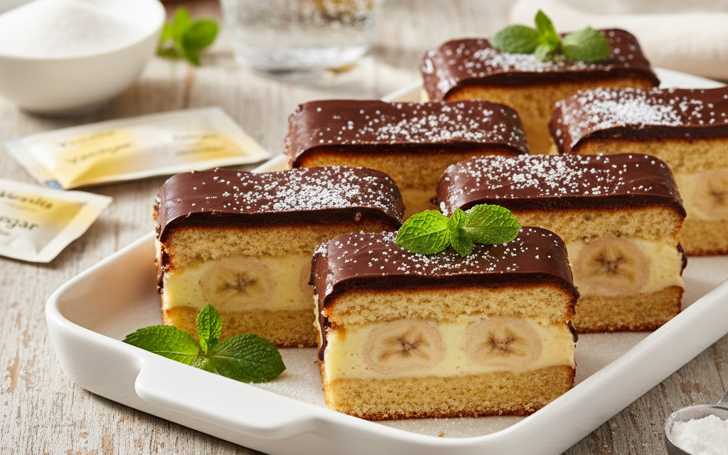 Bananenschnitten sind ein echter Klassiker der österreichischen Backstube – und diese vegane Version steht dem Original in nichts nach! Mit luftigem Biskuitboden, cremigem Vanillepudding, frischen Bananenscheiben und einer glänzenden Schokoglasur ist dieses Rezept ein absoluter Publikumsliebling.