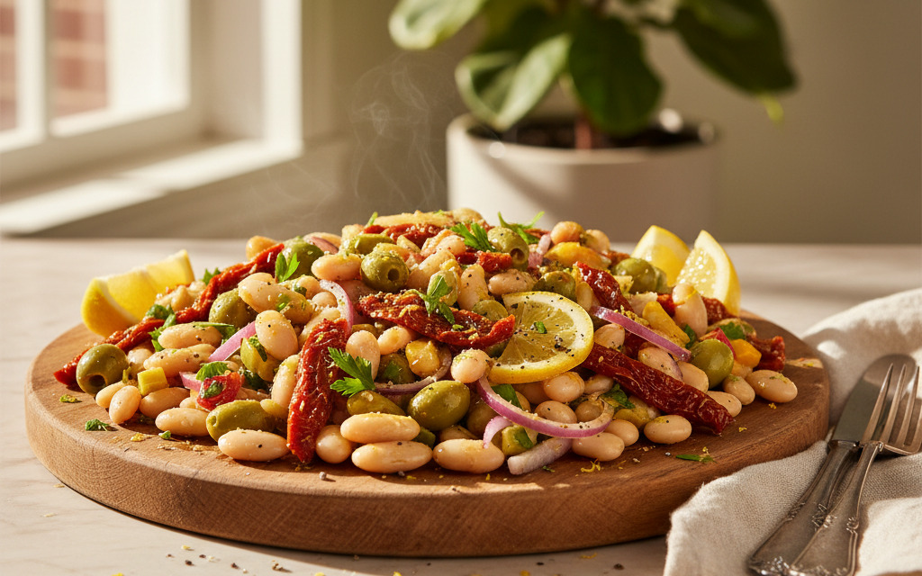 Veganer Weißer Bohnensalat mit grünen Oliven und Zitrusdressing