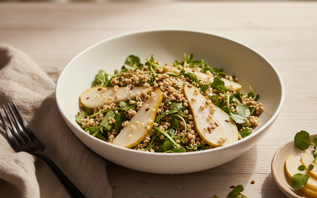 Veganer Braunhirse-Salat mit Brunnenkresse & Birne