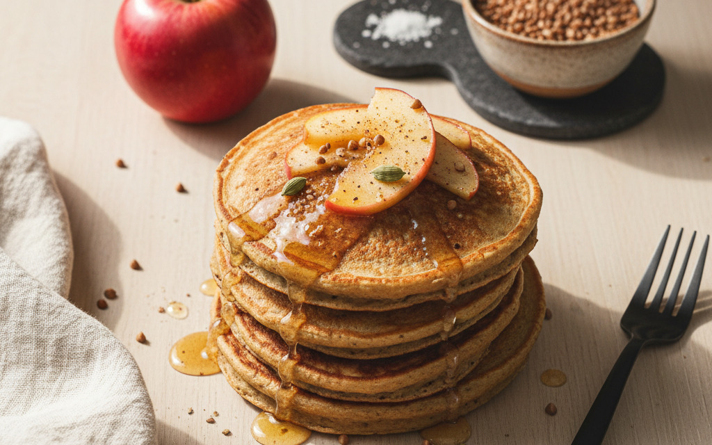 - Buchweizen mit dem Einweichwasser, kleingeschnittenem Apfel, Kardamom und Salz mixen, so dass ein Teig entsteht.
