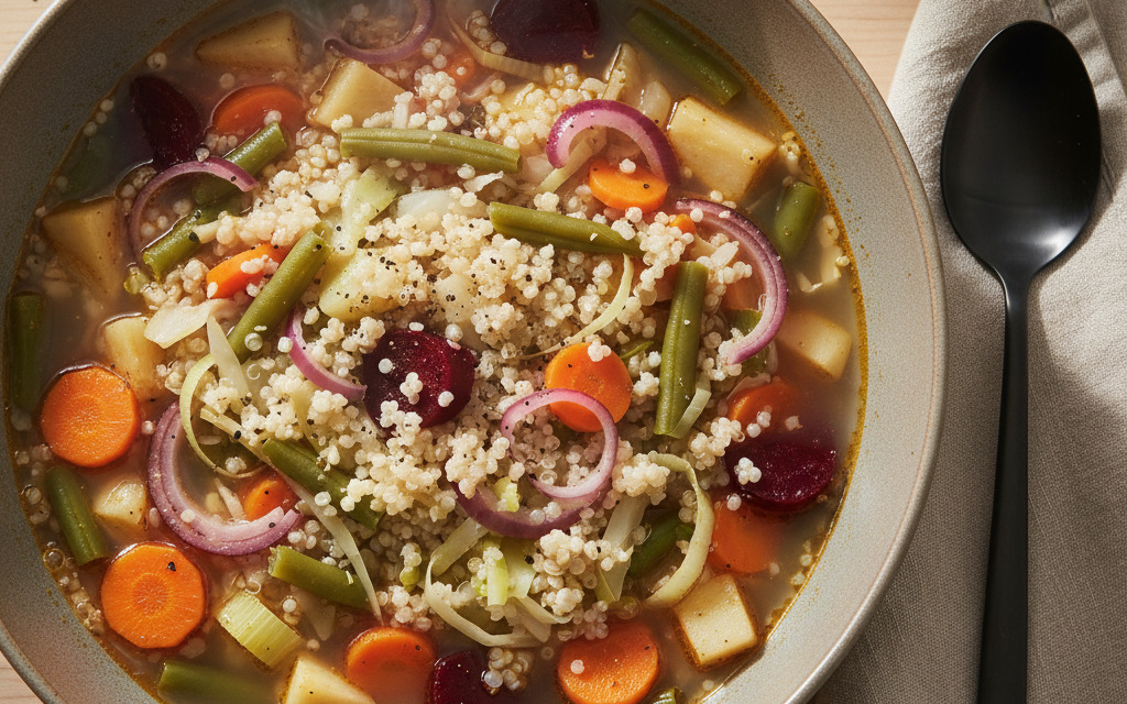 Diese bunte vegane Gemüsesuppe ist der perfekte Seelenwärmer für kalte Wintertage! Die Kombination aus proteinreichem Quinoa und farbenfrohem Wurzelgemüse macht sie nicht nur optisch zum Hingucker, sondern liefert auch jede Menge Nährstoffe.