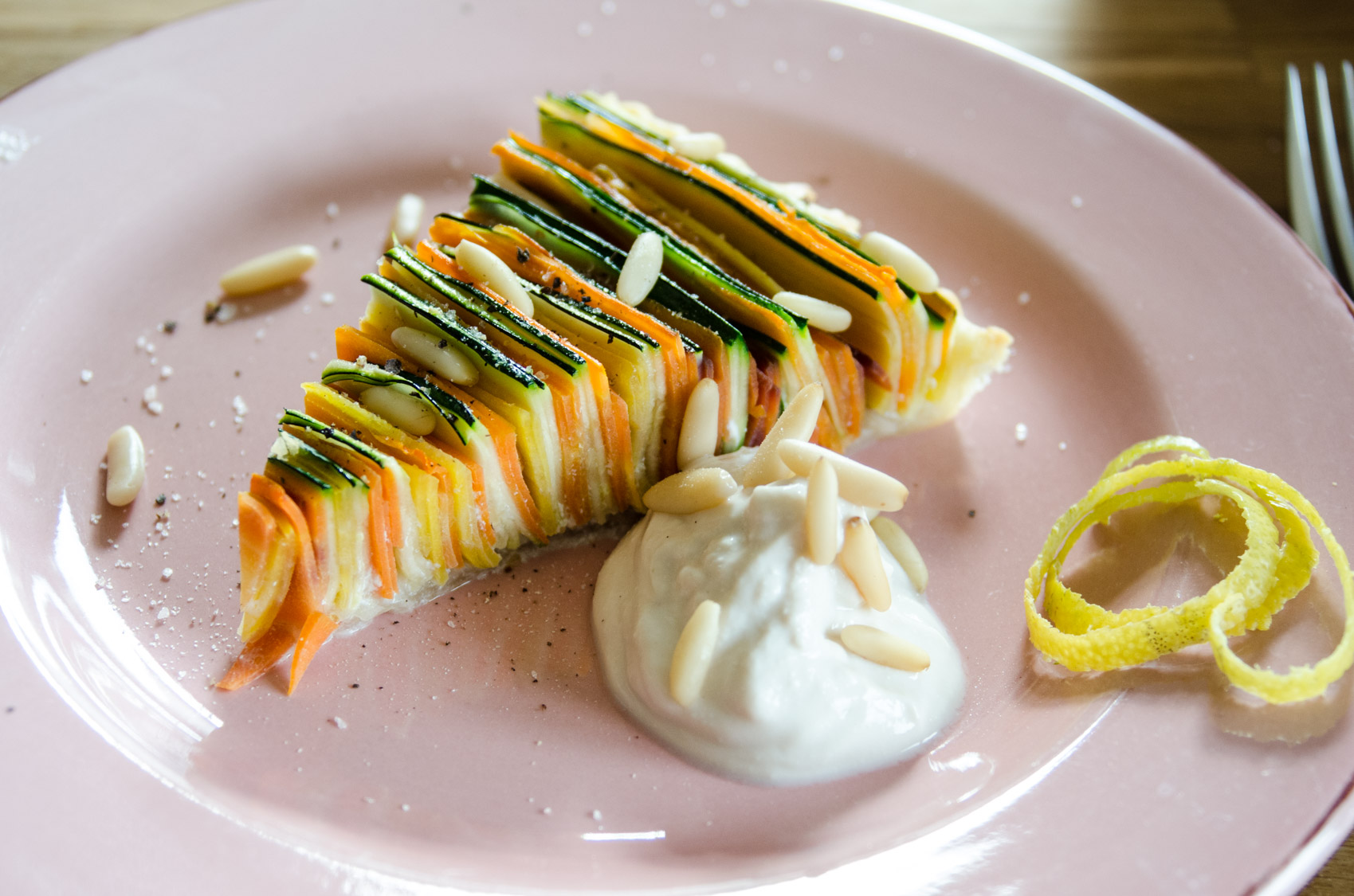 Die Karotten und gelben Rüben für 4min dämpfen. So lassen sie sich besser rollen. Nun das Gemüse abwechselnd spiralförmig aufrollen bis der Boden belegt ist.