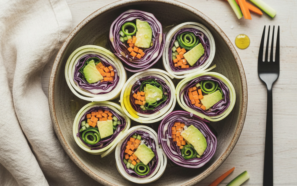- Nun die Krautblätter auf 5cm breite, längliche Streifen ohne Strunk zuschneiden, mit Krautsalat und Karotten füllen und fest aufrollen, so dass es in die Zucchini hineinpasst.