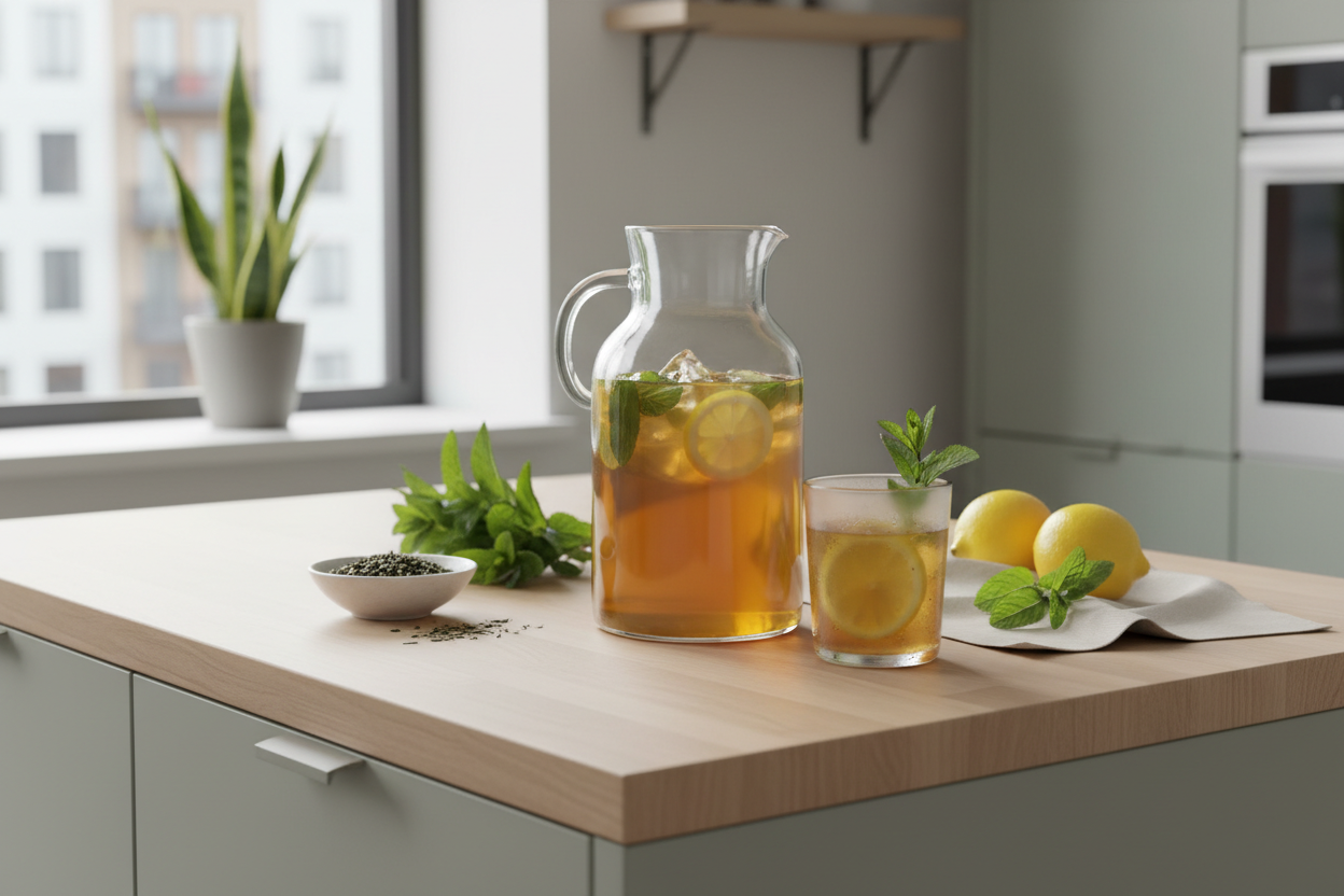Selbstgemachter Eistee ist das Beste, was dir an einem heißen Frühlungs- oder Sommertag passieren kann. Kein Zuckerbomben-Fertigpulver, keine künstlichen Aromen - nur Grüntee, frische Minze und Zitrone. Fertig in 15 Minuten, der Rest erledigt der Kühlschrank.