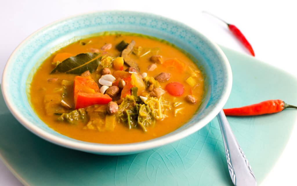 - Zwiebel und Paprika in dem Kokosöl anbraten, den Kreuzkümmel und den Cayennepfeffer kurz mitrösten. Mit der Gemüsebrühe und den Tomaten aufgießen. Das Weisskraut, die Karotten, Salz und den Thymian zugeben, die Erdnussbutter unterrühren und köcheln lassen bis das Gemüse leicht bissfest ist.