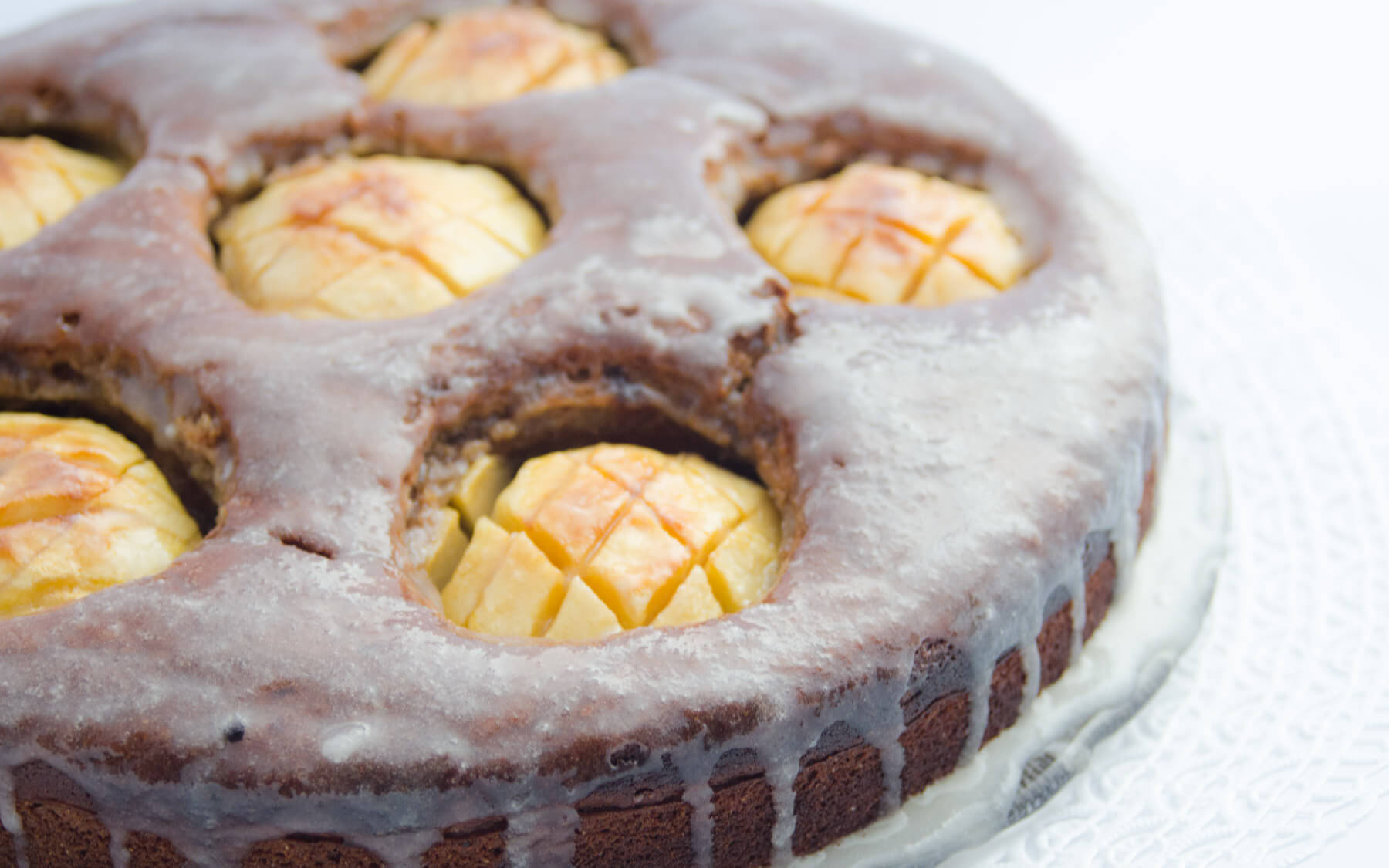 - Die Zutaten für die Glasur glatt rühren und den Kuchen damit einpinseln. Kurz warten bis die Glasur fest ist und am besten noch lauwarm genießen.