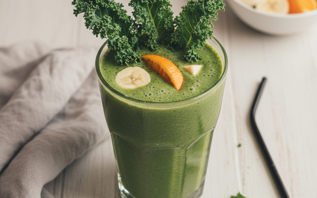 - Die harten Stengel vom Grünkohl entfernen. Die Blattteile mit dem Wasser in den Blender geben und mixen bis alle Stücke, Fasern etc. aufgelöst sind.