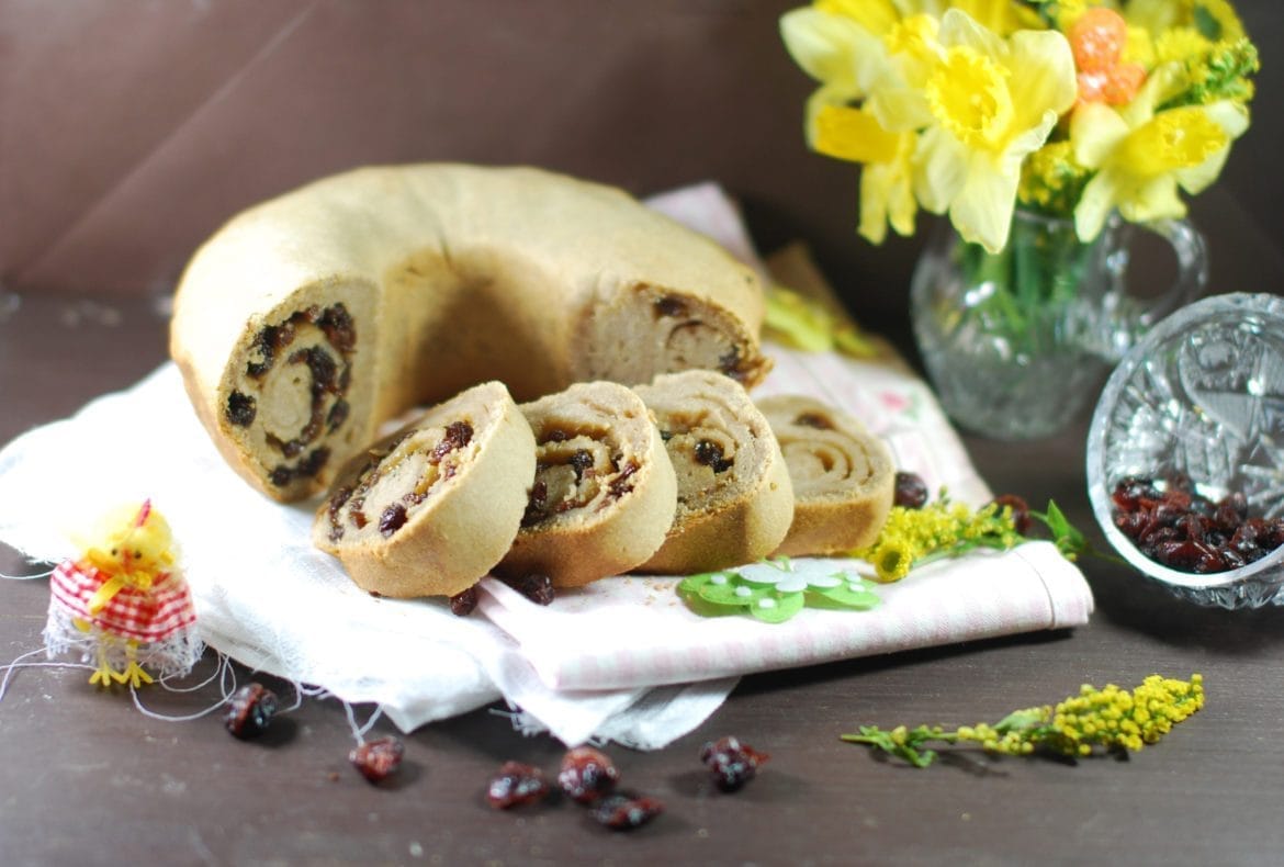 - Nun die Rosinen abgießen und auf dem Rechteck verteilen, die Ränder etwa 3 cm breit frei lassen. Über die ganze Fläche Zucker verteilen und an den Rändern noch etwas mehr Zimt streuen. Nun das Ganze zu einer Rolle einrollen und in eine gefettete Gugelhupfform legen.