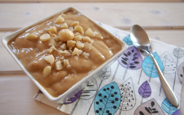 In gerade einmal fünf Minuten zauberst du ein Dessert, das nach Karamell-Eis schmeckt, aber viel gesünder ist. Die Kombination mit knackigen Macadamia-Splittern gibt dem Ganzen den perfekten Crunch.