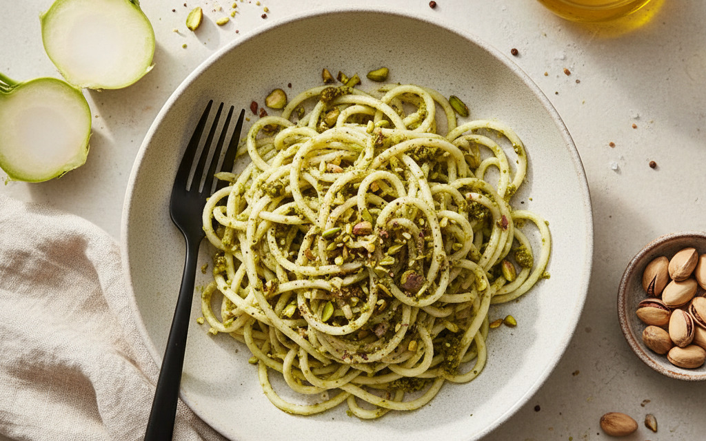 Vegane Kohlrabi-Pasta mit Pistazien-Pesto