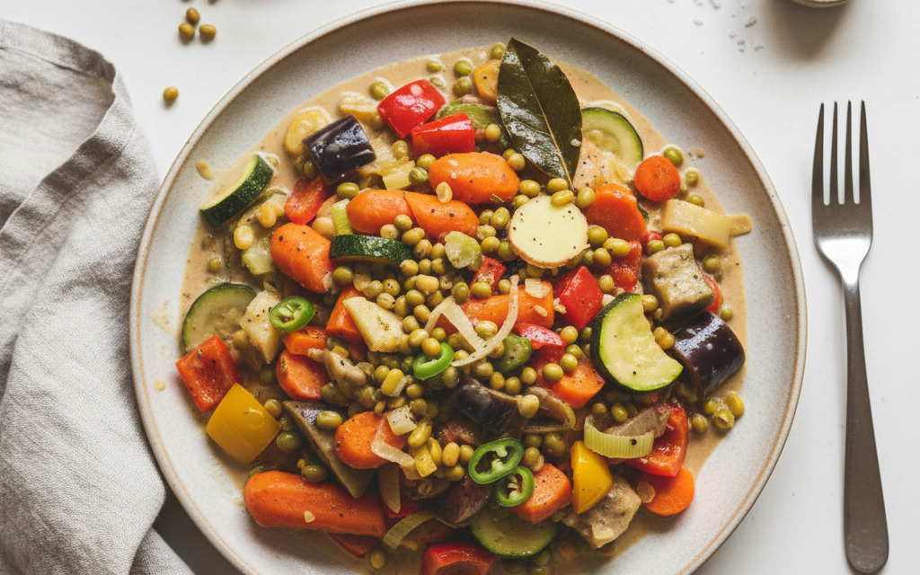 Buntes veganes Kokos-Gemüse mit Mungbohnen
