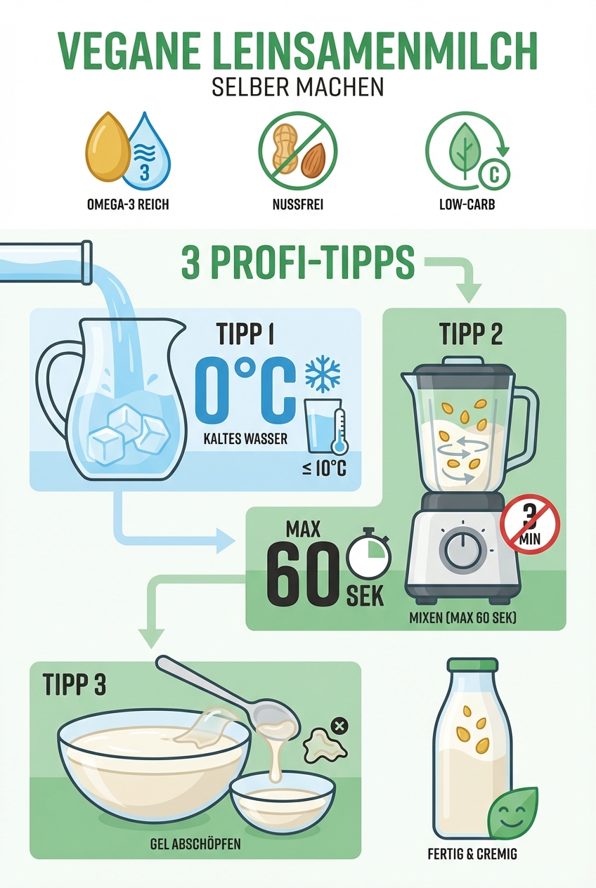 - Schritt 1: Die Leinsamen und das kalte Wasser in einen Hochleistungsmixer geben. WICHTIG: Niemals heißes Wasser verwenden - das macht die Milch schleimiger!