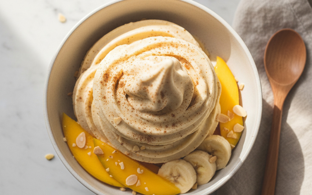 - Das gefrorene Obst mit der Mandelmilch im Blender mixen. Ev. mehr Milch zugeben bis ein schönes Softeis entsteht. Sofort genießen!