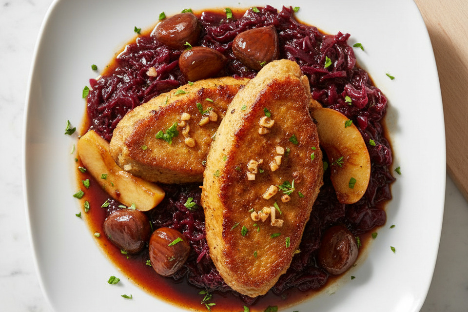 - Veganes Geflügel oben auf das Rotkraut