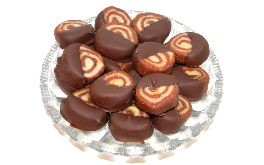 - Die Rolle in etwa 1cm dicke Scheiben schneiden und zur Hälfte in die Schokolade tauchen. Auf Backpapier trocknen lassen.