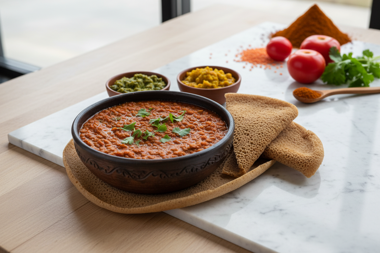 - Heiß servieren, optional mit frischem Koriander garnieren. Dazu passt traditionell Injera (äthiopisches Fladenbrot) oder alternativ Fladenbrot oder Reis.