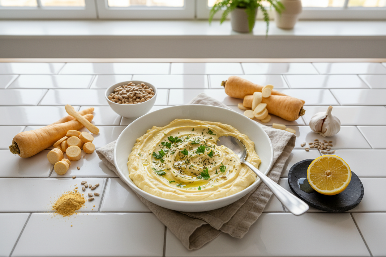 Pastinaken kennt man meist aus der Suppe - aber als cremiger Aufstrich entfalten sie eine ganz eigene, sanft-süßliche Tiefe. Kombiniert mit weißen Bohnen wird die Creme herrlich sämig und proteinreich, die Hefeflocken geben einen leicht nussigen, käsigen Geschmack. Das Schöne: Mehr als ein Topf und ein Mixer braucht es nicht, und in 20 Minuten steht der Aufstrich fertig auf dem Tisch.