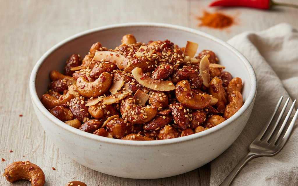 - In einer großen Schüssel Nüsse, Kokosflocken und Sesam vermischen und das Dressing dazugeben.
