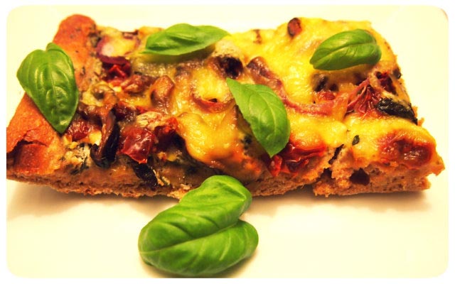 Mit Pilzen, getrockneten Tomaten, Zwiebel und weiteren Zutaten nach Belieben belegen und bei 200°C 20-25min backen.