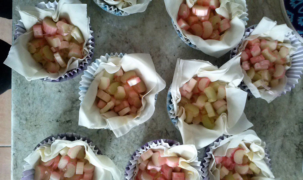 Rhababer in dünne Stücke scheiden und die Muffins damit belegen.