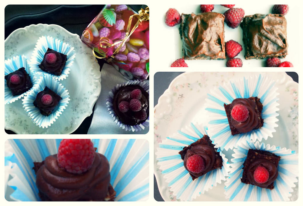 Nach der Kühlzeit den Boden in kleine Quadrate schneiden und mit dem Frosting und Früchten verzieren.